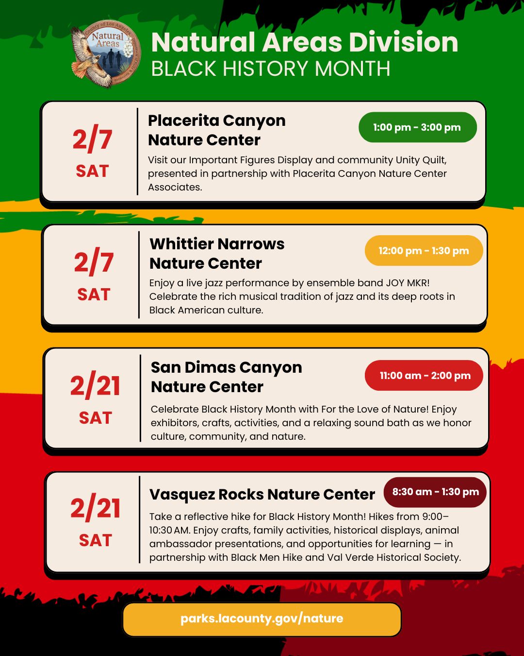 Celebrate Black History Month with LA County Parks from February 5–28 through a series of workshops, art, music, storytelling, and community events honoring the achievements, contributions, and resilience of Black Americans. Join us in celebrating Black culture, heritage, and community throughout the month. For information visit, parks.lacounty.gov/bhm.