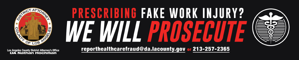 For more information or to report suspected workers’ compensation fraud, contact the District Attorney’s Office at reportheathcarefraud@da.lacounty.gov or (213) 258-2365.